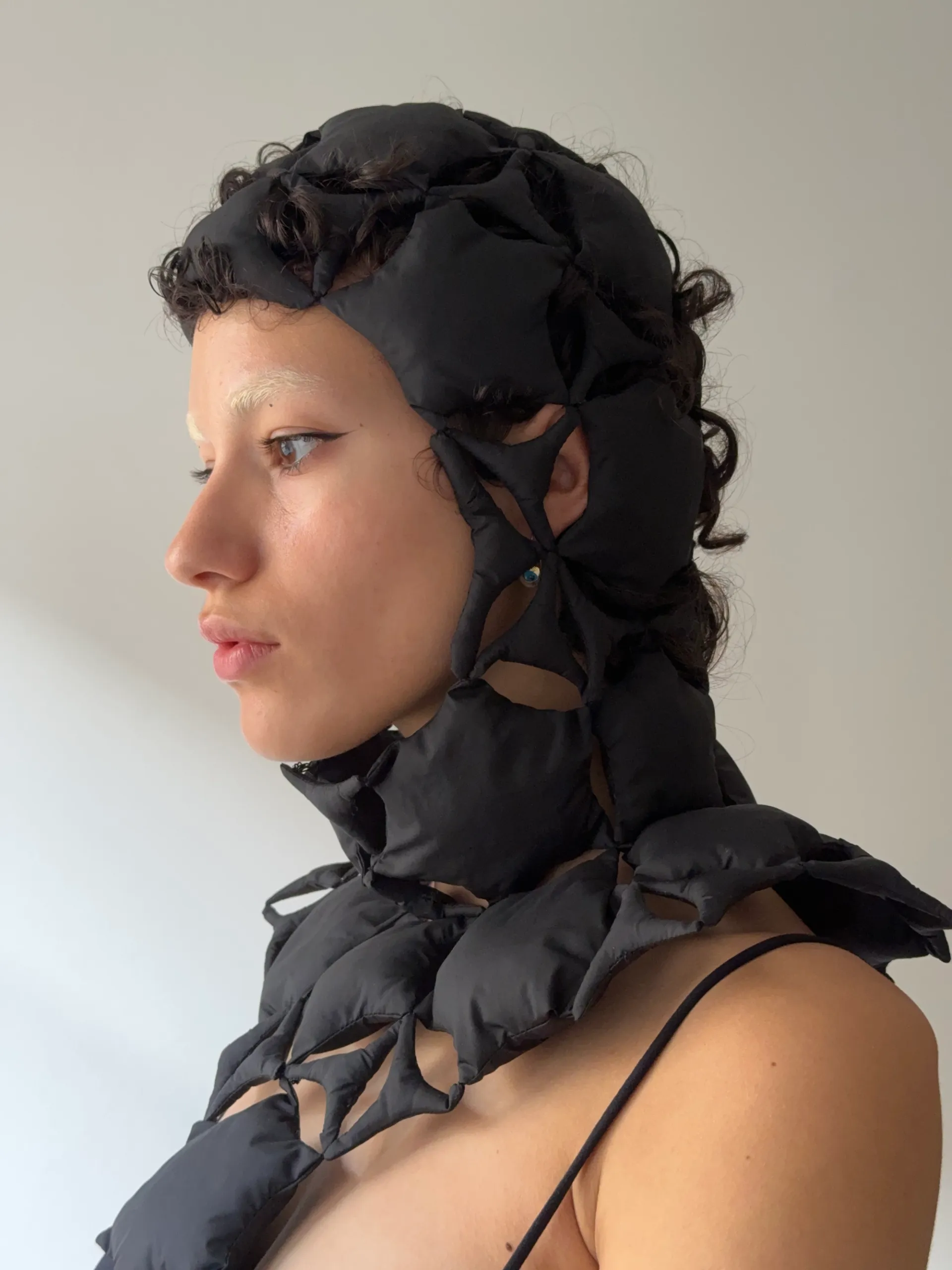 Nylon Sacred Star Balaclava made of 65 individual padded stars, inspired by microscopic images of sand, hand sewn together. This piece has 5 small hook and latch clasps at the front to secure it on while being worn.